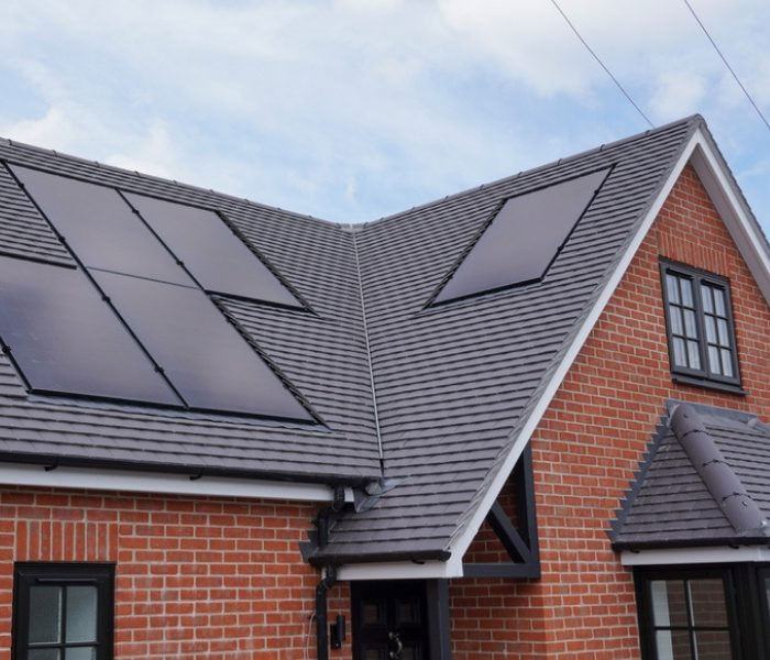 Brick house with dark roof tiles featuring solar panels installed on both sides of the pitched roof.
