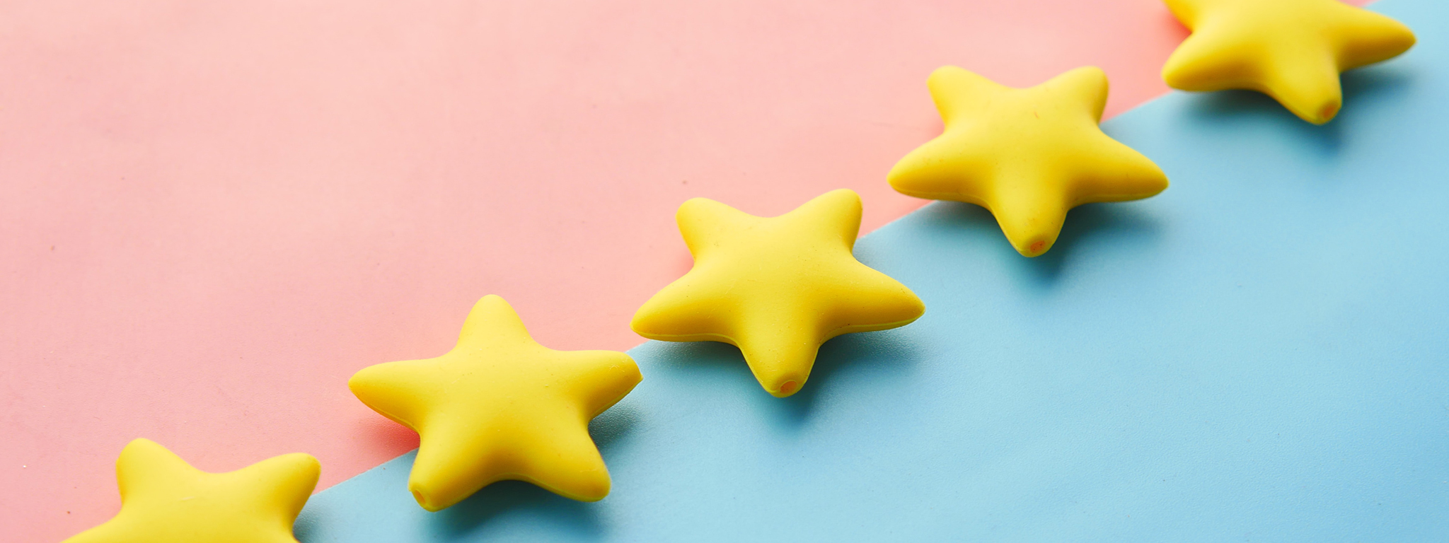 Five yellow star-shaped objects arranged in a line on a pink and blue background.
